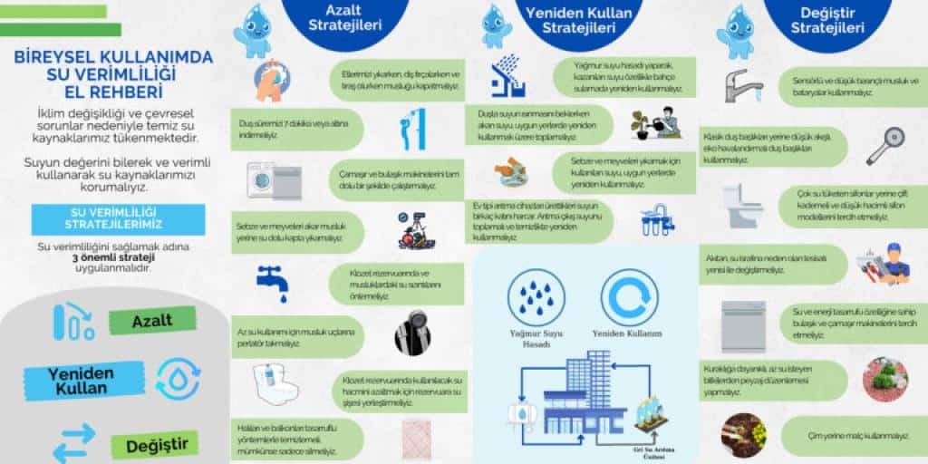 Su kayıplarının azaltılması; yağmur suyu hasadı, gri suyun kullanımı, arıtılmış atıksuların yeniden kullanımı gibi yöntemlerle alternatif su kaynaklarının kullanımı; tarımda, sanayide, bireysel su kullanımlarında verimli teknolojilerin kullanımı ve bilinçli üretimin yaygınlaştırılması; bireysel su kullanım alışkanlıkların iyileştirilmesi vb. ana verimlilik uygulamaları çerçevesinde eylemler belirlenmiştir.